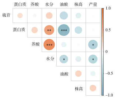 豌豆生长指标与营养品质指标相关性分析结果显示(图 3),产量与芥酸、水分含量呈显著负相关(P < 0.05);蛋白质与水分呈极显著正相关(P < 0.01),与油酸呈极显著负相关(P < 0.001);芥酸与水分呈极显著正相关(P < 0.001);水分与油酸呈显著负相关(P < 0.05),其余指标之间相关性不显著。