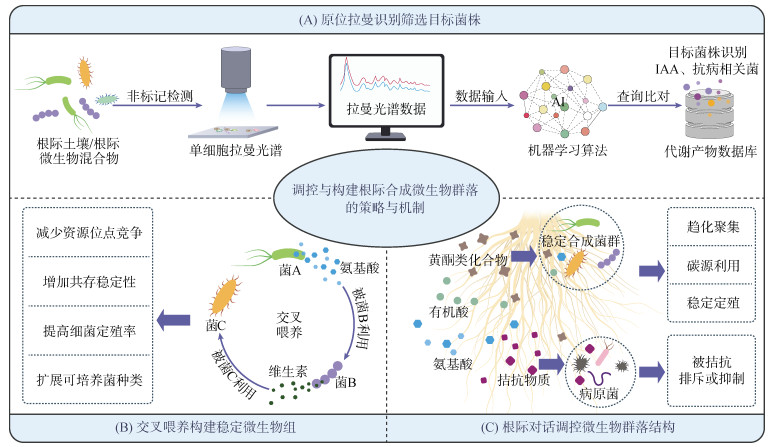 (A. 利用原位拉曼技术先筛后选,分离本土功能菌;B. 通过交叉代谢通路,解析菌群间的交互关系,设计稳定的合成菌群;C. 通过根际对话建立稳定定殖的合成菌群) 图 2 合成菌群的设计流程 Fig. 2 Design process of synthetic bacterial communities |