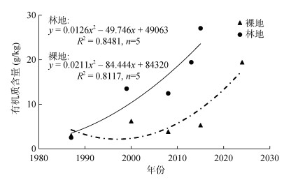 2 结果与讨论 2.1 近40年不同利用方式土壤机械组成和有机质变化特征红壤站长期监测数据(表 1)表明,在监测初期(1987年)裸地和林地间土壤理化性质差异不显著。随时间推移,裸地和林地土壤均呈现砂粒含量增加、黏粒含量降低的趋势,粉粒的含量变化不大;裸地和林地的土壤有机质含量均呈现明显上升的趋势。尽管裸地没有种植植被,但存在少量苔藓及草本植物生成的土壤结皮,随着时间推移使得土壤有机质缓慢增加。裸地与林地的土壤有机质增加趋势具有显著差异(图 1),1987年裸地和林地土壤有机质含量基本一致,随着时间推移,林地植被更替,有机质含量明显上升。各个时期林地土壤有机质含量均高于裸地,且林地土壤有机质含量的增加速度明显高于裸地。2015年林地土壤有机质含量为27.07 g/kg,相较1987年,28年间林地土壤有机质含量提高了近10倍;2024年裸地土壤有机质含量为19.43 g/kg,37年间裸地土壤有机质含量提高了近5.5倍,两种利用方式土壤有机质状况均得到了极大的改善。