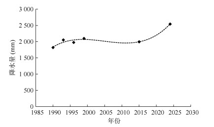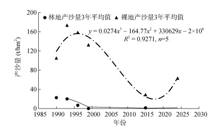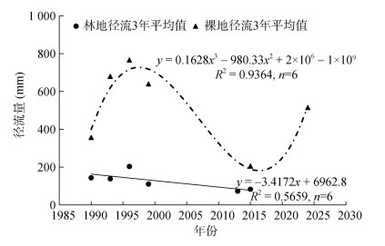 1989—2015年林地的径流泥沙数据来自1个562.5 m2的自然恢复小区以及2个200 m2的花生+柑橘套作处理的径流小区,小区均位于红壤站,气候和土壤条件一致。且自然恢复小区和花生+柑橘套作小区在2015年均有径流泥沙数据,数据基本一致。但自然恢复小区和花生+柑橘套作小区是植物措施、坡度、面积不同的样地,样地不匹配,仅能代表长期变化趋势。1989—2024年裸地的径流泥沙数据来自1个146.3 m2的自然坡地以及10个100 m2的标准径流小区,小区均位于红壤站,气候和土壤条件一致。但自然坡地小区和标准径流小区是坡度、面积、监测时间不同的样地,样地不匹配,仅能代表长期变化的趋势。本研究基于每3年的平均径流和泥沙监测值,拟合曲线,反映近40年来的径流泥沙变化的大概趋势,构建土壤侵蚀演变的时间序列。