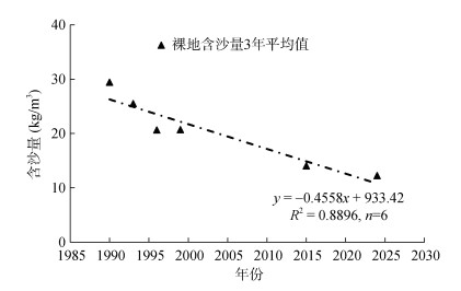 红壤坡地产沙量变化,本研究使用3年平均观测值进行考量(图 4)。近40年来,裸地产沙量的变化与其径流量变化相似,均呈现先升高后降低再升高的趋势;林地产沙量逐年降低,并在1996年林地乔灌草结构形成后几乎趋于0。这一趋势与孙雪娇等[23]的研究结果基本吻合,其对天山北坡山地的研究发现,2009—2015年裸地产沙量先升后降,之后随侵蚀基准面降低呈波动式上升,而林地产沙量逐年递减。值得注意的是,本研究中裸地产沙量的峰值早于其径流量峰值,产沙量最大值出现在1992—1994年间,径流量最大值出现在1995—1997年间,表明在1994—1995年间裸地土壤抗蚀性发生转变。温永福等[24]与牟丽敏等[25]在裸地径流小区试验中同样发现“产沙量先达峰、径流峰滞后”的现象,且当径流量继续增大时,产沙量反而趋于稳定或略有下降。由于产沙量与径流量变化不同步,径流含沙量能更好地反映裸地的侵蚀量。从裸地径流含沙量来看,其呈现逐年直线下降的趋势,在1987—2024年裸地径流含沙量每3年的平均值降低至原来的约42%(图 5)。这解释了裸地产沙量变化与裸地径流量变化不完全一致的现象。