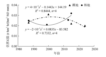 4) 土壤可蚀性K值分析显示,裸地由于前期侵蚀严重、后期有机质逐步积累,使得K值先升后降;林地尽管初期K值下降,但后期因土壤黏粒含量降低,质地粗骨化,导致K值回升,因此在长期植被恢复下仍存在潜在侵蚀风险。
