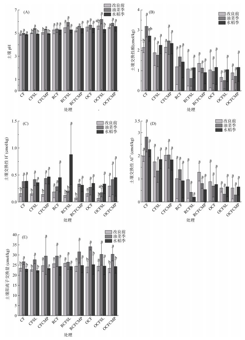 2 结果与分析 2.1 酸化土壤改良对土壤酸度及阳离子交换量的影响本研究发现各处理的土壤pH均在油菜季提高,在水稻季结束后降低,且大部分处理降低到了低于或接近改良前的数值(图 1A)。9组处理中,RCF、RCFCMP、OCFCMP处理改良后最终的pH高于初始值,但提升并不显著(P > 0.05)。相较于油菜季,CFSL、CFCMP和OCFSL处理在水稻季结束后pH显著降低(P < 0.05)。常规的化肥施用处理(CF、CFSL、CFCMP)下,土壤交换性酸含量高于其他处理(图 1B)。RCFCMP处理pH在水稻季结束后增长4.12%,同时也抑制了土壤交换性酸含量的增加(降低了33.17%)。其他处理的土壤交换性酸相较于改良前均有不同幅度的提高,CF处理在油菜季显著提高(P < 0.05)。土壤交换性酸含量在改良后提升幅度最大的为OCFSL处理,其增长率达到了56.44%。各处理的交换性H+含量有上升趋势,特别是常规化肥施用的CF、CFSL、CFCMP处理以及RCFSL、RCFCMP、OCFSL处理显著提高(图 1C)。改良后各处理交换性Al3+与交换性酸呈现相似变化趋势,增幅最大的为CF,提高了14.30%,降幅最大的为RCFSL,降低了77.96%,其余处理均呈现出下降或基本不变的趋势(图 1D)。由于试验中交换性Al3+的变化均不显著,且改良后基本趋于不变或下降,因此土壤交换性酸的上升趋势可能与交换性H+的变化有关。各处理的土壤阳离子交换量表现为先上升后下降,且最终与改良前相比均未有显著变化(图 1E)。由此可见,与常规化肥处理相比,施加钙镁磷肥的处理抑酸潜力突出,可以有效抑制土壤交换性酸和交换性Al3+。
