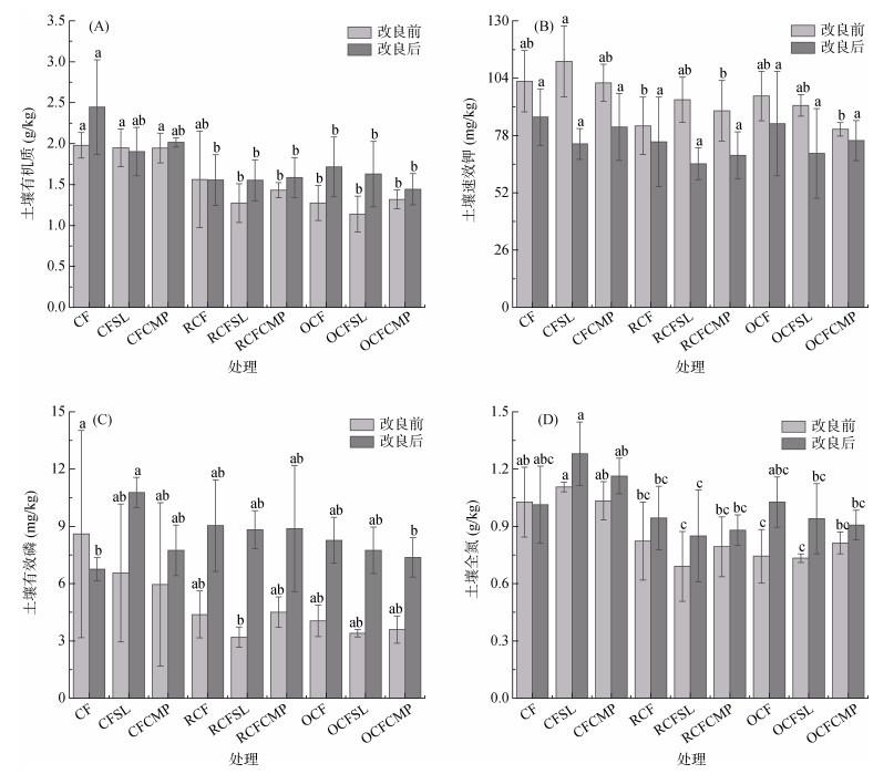 (图中小写字母不同表示改良前或改良后处理间差异达P<0.05显著水平) 图 2 不同处理对土壤肥力的影响 Fig. 2 Effects of different treatments on soil fertility |