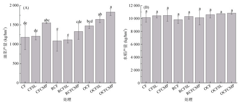 改良措施对油菜产量影响显著(图 3A)。在化肥施加条件相同时,施加钙镁磷肥的处理油菜产量更高,在各处理中增产效果最好,单独化肥处理油菜产量最低。所有处理中,OCFCMP处理油菜产量最高,为1 831.5 kg/hm2。有机肥替代化肥处理下,油菜产量相较于常规化肥处理增产25.00% ~ 55.08%。各改良处理下水稻产量差异不显著,均达到9 800 kg/hm2,其中有机肥替代化肥的3个处理水稻产量总体更高,均超过10 500 kg/hm2(图 3B)。