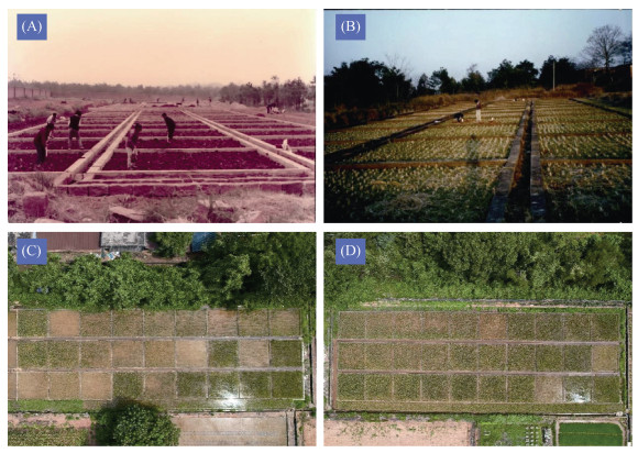 (A:建设场景;B:20世纪90年代采样场景;C:2023年施肥制度与养分循环试验航拍;D:2023年有机质积累与平衡试验航拍) 图 1 瘠薄红壤稻田肥力演变长期定位试验部分场景 Fig. 1 Some scenarios of the long-term field experiment on fertility evolution of infertile red paddy fields |