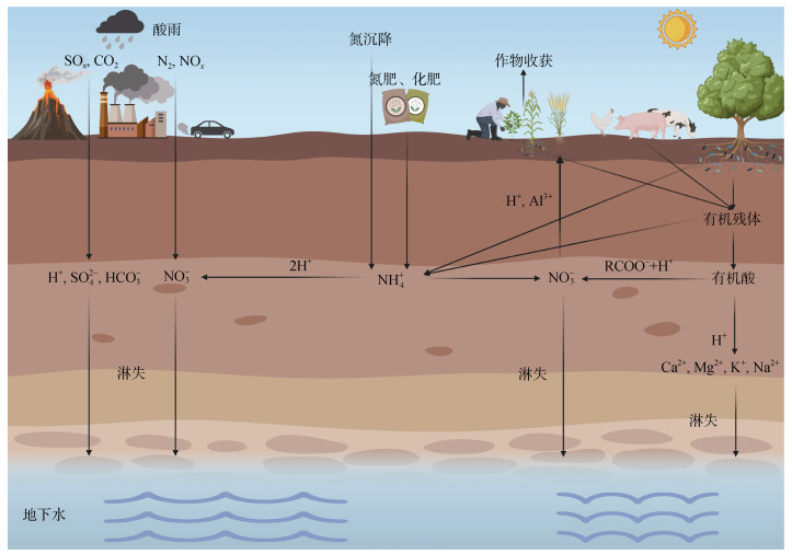 (图中箭头表示物质迁移和化学转化方向,土壤颜色深浅反映酸化程度) 图 1 土壤酸化过程及机理[12] Fig. 1 Process and mechanism of soil acidification |