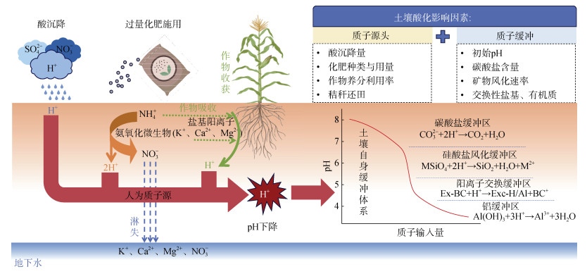 图 1 土壤酸化原理及影响因素 Fig. 1 Mechanisms and influencing factors of soil acidification |