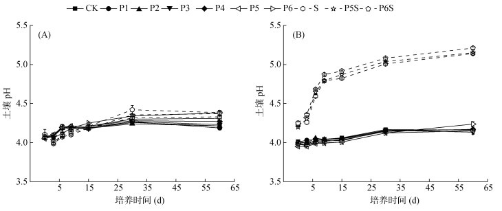 2 结果与分析 2.1 不同磷梯度和秸秆处理下土壤pH变化施用磷肥和秸秆后,土壤pH的变化如图 1所示。随培养时间的延长,两种成土母质发育的红壤不施肥和单施磷肥处理pH均显著提高(图 1A,1B)。赤红壤施用秸秆处理pH随培养时间延长持续升高;而红壤施用秸秆处理土壤pH呈先降低后升高的变化趋势,至培养第3天达最低值,此后土壤pH显著升高。培养结束时,红壤的P5、P6、S、P5S、P6S处理pH较CK分别提高了0.10、0.17、0.12、0.16、0.17个单位(P < 0.05),且P5、P6、S处理间无显著差异;花岗岩发育的赤红壤,P6、S、P5S、P6S处理pH较CK处理分别升高了0.08、0.98、0.99、1.05个单位(P < 0.05),且S、P5S、P6S处理pH均显著高于P6处理,P6S处理pH显著高于S处理。可见,磷肥和秸秆对土壤pH的提升效果与成土母质密切相关,磷肥仅在高用量下提升pH效果显著,且红壤优于赤红壤,可能与后者有效磷含量高密切相关;玉米秸秆的提升效果优于磷肥,且对赤红壤的效果优于红壤,这可能与赤红壤较低的有机碳含量有关。