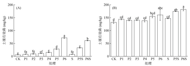 培养结束后,两种土壤有效磷含量均随施磷量的增加而显著升高,而S处理较CK土壤有效磷含量均未显著提高(图 2)。对于红壤,P5S处理较P5处理有效磷含量显著增加,而P6S处理较P6处理有效磷含量显著降低;对于赤红壤,磷肥配施秸秆处理(P5S、P6S)较单施磷肥处理(P5、P6)有效磷含量升高,但差异均不显著,这可能与秸秆施用下土壤碳磷比及微生物活性有关,其作用机理还有待进一步研究。