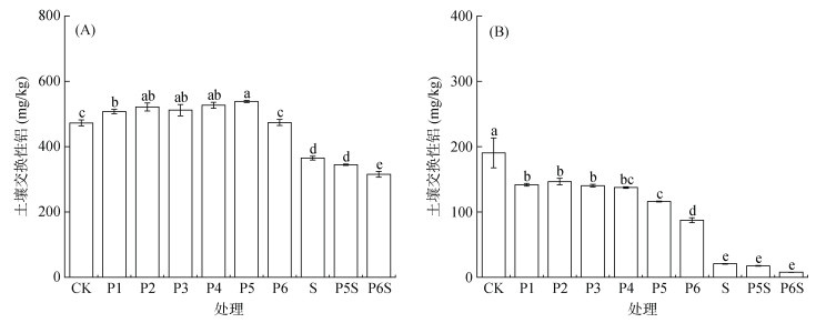 各处理对两种土壤交换性铝含量有显著影响(图 4)。培养结束后,随施磷量的增加,红壤交换态铝含量呈先增加后降低的变化趋势,与CK相比,P1、P2、P3、P4、P5处理的土壤交换态铝含量分别显著增加了7.3%、10.3%、8.3%、11.4%、13.9%(P < 0.05),而P6处理无显著变化;秸秆单施(S)或秸秆与磷肥配施(P5S、P6S)较CK均显著降低红壤的交换态铝含量,降幅为22.8% ~ 33.3%(P < 0.05),且P6S处理土壤交换性铝含量显著低于S处理(图 4A)。与红壤的变化趋势不同,各施磷处理较CK均显著降低赤红壤的交换性铝含量,且随施磷量的增加降幅增大,为23.1% ~ 54.1%;秸秆单施(S)或秸秆与磷肥配施(P5S、P6S)较CK均显著降低了赤红壤的交换性铝含量,降幅为89.1% ~ 95.9%(P < 0.05),但秸秆处理间无显著差异(图 4B)。可见,玉米秸秆降低红壤交换性铝的效果优于磷肥。