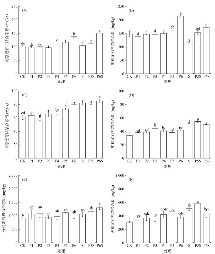 各处理对土壤有机结合态铝含量的影响如图 5所示。与CK相比,红壤P1、P2、P3、S处理弱稳定有机结合态铝含量无显著变化,P4、P5、P6、P5S和P6S处理显著增加,增幅分别为11.2%、14.9%、34.6%、10.3% 和47.2%(P < 0.05),其中以P6S处理最高,其次为P6处理,二者显著高于其他处理(图 5A)。与红壤相似,P5、P6和P6S处理较CK显著提高了赤红壤弱稳定有机结合态铝含量,增幅分别为13.1%、45.1% 和16.1%,而S处理弱稳定有机结合态铝显著降低24.6%(P < 0.05);各处理中以P6处理土壤弱稳定有机结合态铝含量最高,其次为P6S处理,二者显著高于其他处理(图 5B)。由此可见,高施磷量促进了两种红壤弱稳定有机结合态铝的形成。