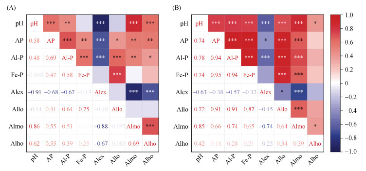 (Alex:交换性铝;Allo:弱稳定有机结合态铝;Almo:中稳定有机结合态铝;Alho:强稳定有机结合态铝;AP:有效磷;Al-P:铝磷;Fe-P:铁磷。*、**、***分别表示相关性达P<0.05、P<0.01和P<0.001显著水平。下同) 图 6 红壤(A)和赤红壤(B)土壤性质的相关性分析 Fig. 6 Correlation analysis of soil properties of red soil (A) and latosolic red soil (B) |