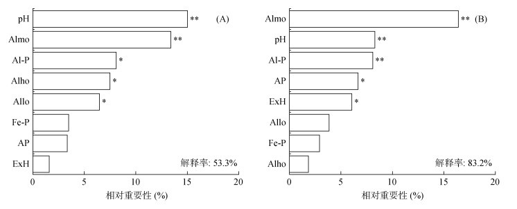 (A:红壤;B:赤红壤。ExH:交换性氢) 图 7 土壤性质对交换性铝含量变化的贡献 Fig. 7 Random forest analyses for different factor contribution on exchangeable aluminum |