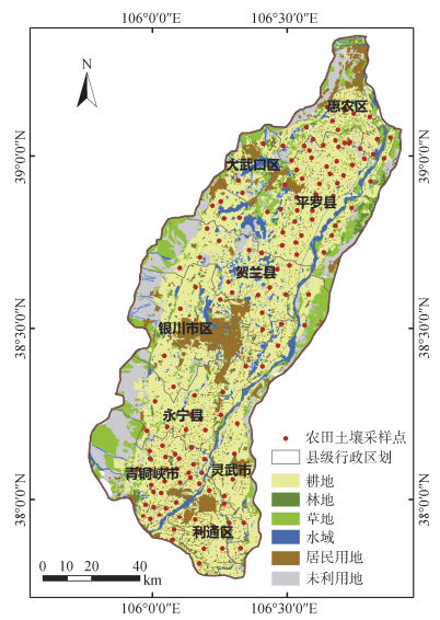 1 材料与方法 1.1 研究区概况银川平原位于宁夏回族自治区北部(37°46′ N~39°23′N,105°45′E~106°56′E),南北长约165 km,东西宽约60 km,区域面积约为7 615 km2,包括石嘴山市惠农区、大武口区和平罗县,银川市兴庆区、金凤区、西夏区、贺兰县、永宁县,以及银川市灵武市和吴忠市利通区、青铜峡市部分地区(图 1)。该区域平均海拔1 100 m,属内陆温带干旱区,年均降水量不足200 mm,年均蒸发量近2 000 mm,年平均光照3 000 h左右,四季分明,气候温和,区域内黄河流程约280 km,年过境水量约325亿m3,光、热、水、土等农业自然资源配合良好,自古以来就是我国西北重要的灌溉农业区,玉米、小麦、水稻及瓜果蔬菜等农作物高产稳产,品质优良,素有“天下黄河富宁夏”的美名[21]。