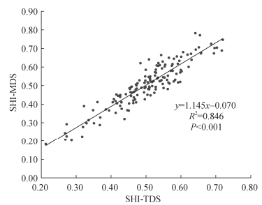 为验证基于最小数据集评价研究区土壤健康的合理性和准确度,分别将全数据集16个指标和最小数据集8个指标的标准化值及其权重代入土壤健康指数计算公式,得出基于全数据集和最小数据集的土壤健康指数SHI-TDS和SHI-MDS。结果显示,SHI-TDS介于0.21~0.72,平均值0.50,变异系数19.42%;SHI-MDS介于0.18~0.78,平均值0.51,变异系数24.05%。基于最小数据集与全数据集的健康指数均值相近,前者变异程度略大于后者。SHI-MDS和SHI-TDS之间的线性回归分析结果如图 2所示,可见,二者所构建线性回归方程拟合效果良好(R2=0.846,P<0.001)。由此可见,本研究所筛选的最小数据集可以较好地代表全数据集对研究区土壤健康状况进行评价。