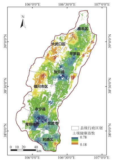 基于最小数据集的银川平原农田土壤健康指数空间分布如图 3所示,各县(市、区)土壤健康指数统计结果见表 7。结果显示,银川平原农田土壤健康指数整体呈现由南向北逐渐降低的趋势,局部地区分布不均,空间异质性较大。位于银川平原南部的青铜峡市农田土壤健康指数均值最高(0.57),其次为南部的利通区、灵武市和永宁县,而位于银川平原北部的平罗县农田土壤健康指数均值最低(0.43),同时位于北部的惠农区以及中部的银川市农田土壤健康指数均值较低。