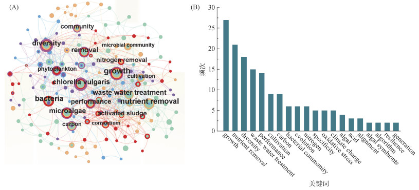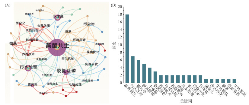 图 2 2020—2024年CNKI平台上有关“藻菌共生”文献的关键词网络共现谱图(A)和统计(B) Fig. 2 Co-occurrence network analysis (A) and statistics (B) of keywords of algal bacteria symbiosis-related literature on the CNKI platform from 2020 to 2024 |