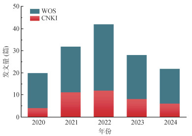 统计Web of Science和CNKI两数据库中2020—2024年该领域每年的发文数量(图 3),可见藻菌共生相关论文成果产出较为稳定,每年发文量为30余篇,且主要以英文论文的形式刊出,中文论文年平均发文量不足10篇,说明以中文发表的有关藻菌共生的研究与成果有待提升。值得一提的是,2022年相关论文发表数量最多,达40余篇,说明此年藻菌共生的研究热度最高、成果最多。