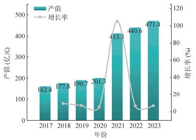 近年来,我国微生物菌肥市场规模逐年扩张(图 4)。从2017年的162.4亿元显著增长至2023年的471.4亿元,增长了190.3%;2021年增长尤为显著,较2020年增长了105%;2021年以来,呈现持续稳步增长态势。未来微生物菌肥在肥料市场的占比可能会进一步升高[32-34]。