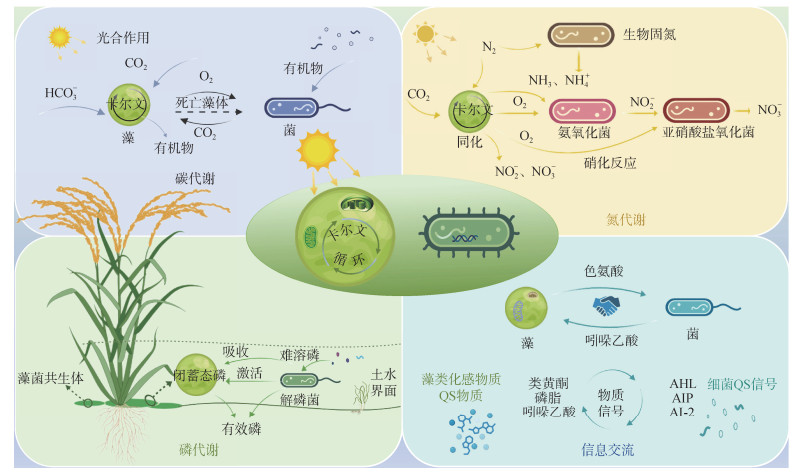 在农业微生物领域,藻类和细菌均有很大的发展应用潜力。稻田藻菌共生的应用是一种通过引入藻类和细菌共生体系来改善土壤肥力和稻田生态环境的技术。宋维民等[52]在黑龙江水稻主产区开展的田间试验中,增施固氮蓝藻和促生细菌SM13处理的水稻产量和稻米品质均有显著提高。Zhang等[57]研究发现,在添加小球藻与细菌群落处理下,增加了土壤有机碳、硝态氮和铵态氮含量,同时脲酶、蔗糖酶和过氧化氢酶活性提高,增强了土壤固氮潜力和硝化潜力,水稻产量提高了60.3%。张慧洁等[50]研究发现,巨大芽孢杆菌和小球藻配合施用,土壤pH从5.2提高至5.6,有效磷含量显著提高了9.0%,土壤微生物反应活性提高了17.76%,为藻、菌复合生物肥的开发和利用提供了可靠的理论基础。Srivastava等[58]研究表明,小球藻(Chlorella)和恶臭假单胞菌(Pseudomonas putida)互作,通过调节磷酸盐运输和相关酶的基因表达进而减少了水稻对砷的吸收。总体上,利用藻菌共生作用促进养分循环、提高土壤肥力已经取得初步效果,但关于稻田藻菌共生的研究还需要大量的探索。