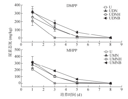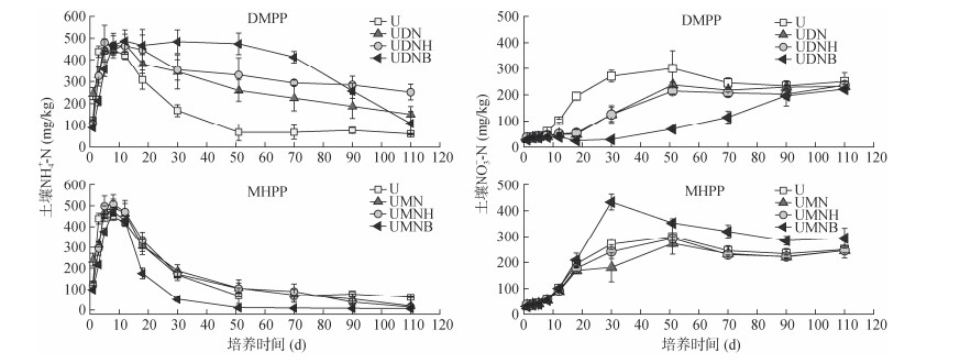 随着培养时间的推移,各处理土壤NH4+-N含量均表现出先增加后减少的趋势(图 3)。相较于U处理,UDN、UDNH、UDNB处理培养期内土壤NH4+-N含量始终处于较高水平。相较于UDN处理,UDNH、UDNB处理进一步延缓了NH4+-N的转化过程,UDNB处理中期(30~90 d)效果较好,UDNH处理后期(90 d后)效果更为稳定。MHPP处理组在延缓NH4+-N转化方面效果不及DMPP处理组。在整个培养期间,MHPP处理组的NH4+-N含量与U处理接近,一直处于较低水平,且处理间差异不大。