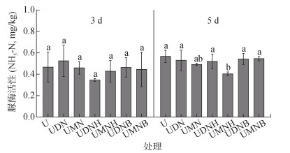 (柱图上方不同小写字母表示不同处理间差异在P < 0.05水平下显著) 图 2 各处理培养前期土壤脲酶活性变化 Fig. 2 Changes in soil urease activity during the early stage of cultivation under each treatment |