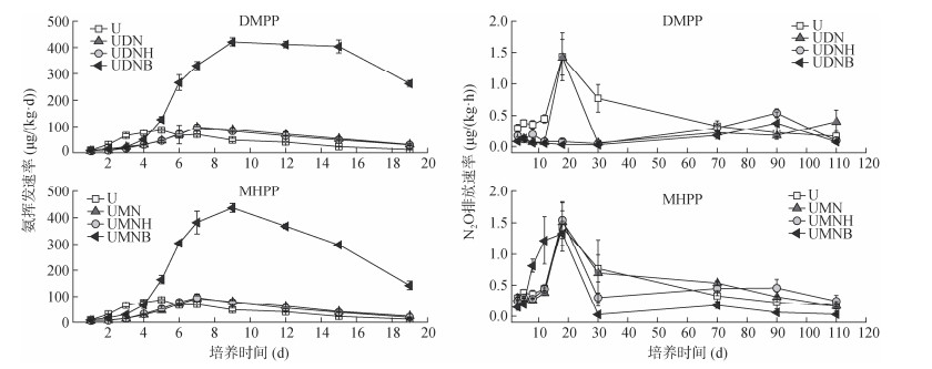 与对照相比,抑制剂添加提高了土壤NH3挥发总量,其中UDN处理作用显著,这与已有研究结论相一致[22]。腐植酸与抑制剂配施对土壤NH3挥发无显著影响,但相比于单独施用抑制剂,腐植酸与抑制剂配施有降低土壤NH3挥发损失的趋势。有研究表明,腐植酸能以生物或非生物方式与土壤中的NH4+-N结合,增强土壤对NH4+-N的固持作用,从而减少氮素以NH3形式损失[28]。腐植酸分子中的羧基也能够提高土壤中NH4+-N的保留量[29]。生物质炭与抑制剂配施显著提高了土壤NH3挥发总量,增幅为496.9%~579.7%。土壤NH3挥发量与土壤NH4+-N含量呈正相关[30]。本研究中,生物质炭与DMPP配施极大程度上抑制了土壤硝化过程的进行,土壤NH4+-N含量显著提高,进而导致生物质炭处理NH3挥发量增加。此外,pH是制约土壤NH3排放的关键因素[31],二者之间呈正相关关系[32]。强碱性生物质炭的添加提高了土壤pH,致使UDNB、UMNB处理土壤NH3挥发量显著提高。生物质炭具有巨大的比表面积与丰富的孔隙度(表 2),施入土壤导致土壤容重降低,通气性增强,进一步加剧土壤NH3的排放[33]。