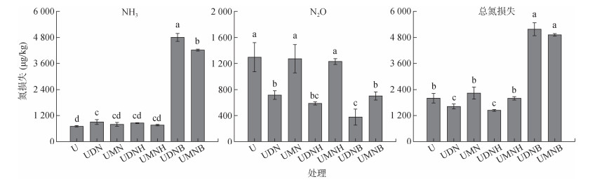 分析各处理施肥110 d内土壤N2O排放速率的变化趋势(图 4)发现,随着培养时间的推移,各处理土壤N2O排放速率总体均呈现先上升后下降的趋势。其中U、UDN处理土壤N2O排放速率峰值均出现在第18天,分别为1.43、1.42 μg/(kg·h)。UDNH、UDNB处理土壤N2O排放速率峰值均后移至第90天,分别为0.54、0.38 μg/(kg·h)。结合土壤N2O排放总量(图 5)可知,相较于U处理,DMPP处理组各处理均显著降低了土壤N2O排放量,降幅为44.83%~70.87%,且UDNB处理与UDN处理之间差异达显著水平,表明在施用抑制剂的基础上增施生物质炭可显著降低土壤N2O排放总量。MHPP处理组中,UMN、UMNH、UMNB处理土壤N2O排放速率均在第18天时出现峰值,分别为1.51、1.54和1.33 μg/(kg·h)。相较于U处理,UMN、UMNH、UMNB处理土壤N2O排放总量下降了1.82%~45.86%,其中UMNB处理与其他处理差异达显著水平。土壤总氮损失受NH3排放量的影响较大(图 5),相较于U处理,UDN、UDNH处理土壤总氮损失下降显著,UDNB、UMNB处理土壤总氮损失显著提高。