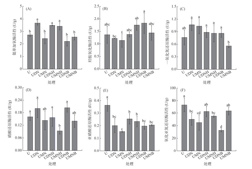 2.4 土壤中氮转化相关酶活性变化抑制剂与有机物料对培养第30天时土壤氮转化相关酶活性的影响如图 6所示。氨单加氧酶、羟胺氧化酶是控制土壤硝化过程的主要酶。UDN、UDNH、UMNH处理土壤氨单加氧酶活性显著高于U处理,增幅为25.14%~34.56%,其余各处理氨单加氧酶活性均较U处理有所下降,但差异未达显著水平。各处理羟胺氧化酶活性与U处理无显著差异,但UMNH、UDNB处理土壤羟胺氧化酶活性分别显著高于UMN和UDN处理。硝酸盐还原酶、亚硝酸盐还原酶、一氧化氮还原酶、氧化亚氮还原酶是控制土壤反硝化过程的关键酶。相较于U处理,除UMNB处理外,其余各处理土壤一氧化氮还原酶活性均有所上升,显著高于UMNB处理。UMNH处理硝酸还原酶活性较U处理显著下降41.67%,而UDN、UDNH、UDNB处理硝酸还原酶活性均显著高于UMNH处理。各处理土壤亚硝酸还原酶活性均显著低于U处理,降幅为30.28%~57.80%。除UDNH、UMNB处理外,其余各处理氧化亚氮还原酶活性均显著低于U处理,降幅为13.37%~55.35%。