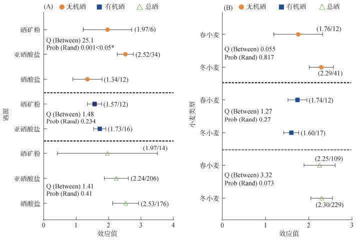 (误差线表示95% 置信区间;Q(Between)表示组间异质性;Prob(Rand)表示组间异质性检验的显著程度;括号内数值表示效应值/样本容量;下同) 图 1 硒源(A)及小麦类型(B)对小麦籽粒中硒含量的影响效应 Fig. 1 Effects of Se types (A) and wheat types (B) on Se contents in wheat grains |