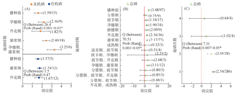 2.2 施硒时期及次数对小麦硒吸收的影响效应不同生育期施加硒对小麦籽粒中无机硒、有机硒及总硒含量的影响差异显著。图 2A显示,播种前、孕穗期、开花期、灌浆期、孕穗期+灌浆期外源施加硒,对小麦中无机硒含量均呈现显著正效应。其中,孕穗期+灌浆期施加硒,对无机硒含量的影响效应值最大,为3.25(95%CI 2.50~4.01),显著高于播种前施硒(1.59 95%CI 1.19~1.98,P<0.05)。灌浆期施硒对小麦中无机硒的影响效应值低于孕穗期+灌浆期施硒,为2.40(95%CI 2.04~2.76),但显著高于播种前施硒(P<0.05)。施硒时期对小麦籽粒中有机硒含量的影响效应值为:灌浆期(1.74)>开花期(1.67)>播种前(1.57),但三者之间无显著性差异。