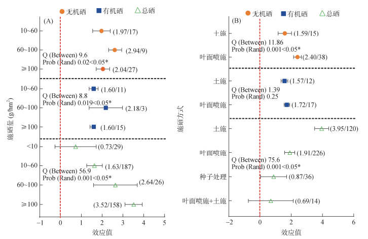 2.3 施硒量及施硒方式对小麦硒吸收的影响效应施硒量对小麦籽粒中无机硒、有机硒含量具有显著正效应(图 3A)。当施硒量为60~100 g/hm2时,对小麦籽粒中无机硒、有机硒含量的影响效应最大,分别为2.94(95%CI 2.31~3.57)、2.18(95%CI 1.38~2.98);当施硒量为10~60 g/hm2时,对小麦小麦籽粒中无机硒、有机硒含量的影响效应最小,分别为1.97(95%CI 1.55~2.39)、1.60(95%CI 1.38~1.81),且不同施硒量之间差异显著(P<0.05)。小麦籽粒中总硒含量结果显示,低施硒量(<10 g/hm2)对籽粒中总硒含量的影响不显著,随着施硒量的增加,影响效应逐渐增加,且达到显著水平。当施硒量≥100 g/hm2时,小麦籽粒中总硒含量的影响效应达到最大,为3.52(95%CI 3.10~3.92),是低施硒处理(<10 g/hm2)的4.8倍。