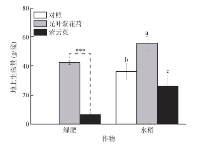 2 结果与分析 2.1 撂荒地绿肥种植对后茬水稻生长及养分吸收的影响如图 1所示,在撂荒地上种植绿肥,光叶紫花苕的种植效果显著优于紫云英,与紫云英地上生物量(7 g/盆)相比,光叶紫花苕地上生物量(43 g/盆)显著增加。在绿肥翻压还田后种植水稻,与对照相比,光叶紫花苕处理后茬水稻地上生物量显著增加,增幅为53%;而紫云英处理后茬水稻地上生物量显著降低,降幅为38%(图 1)。