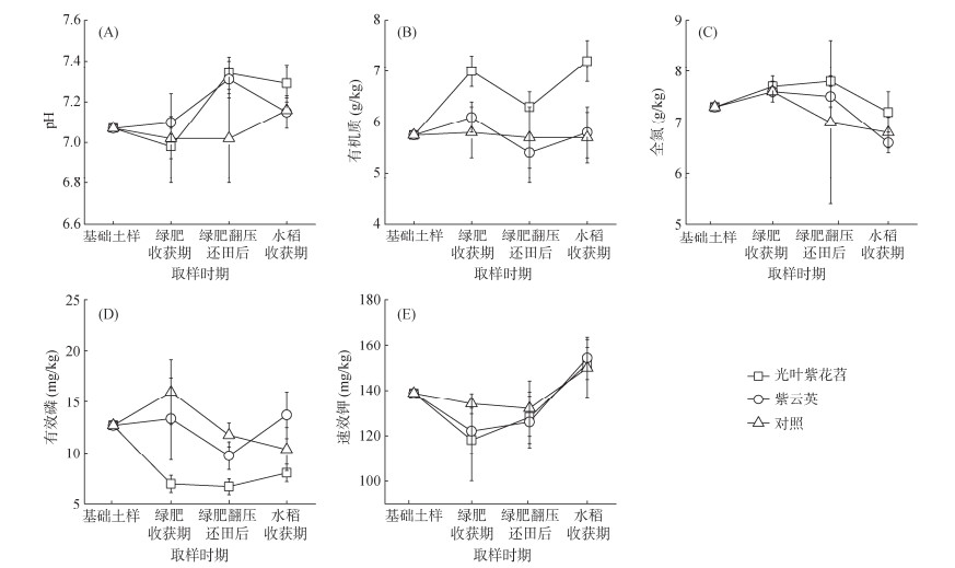 图 2显示了撂荒地绿肥种植后土壤各时期的肥力指标变化。可见,土壤pH随着绿肥生长、收获后翻压及水稻生长而有所波动(图 2A)。对照土壤整个周期pH变化不显著。种植绿肥处理,绿肥收获期土壤pH的变化较小;但在绿肥翻压还田后,土壤pH升高,翻压光叶紫花苕和紫云英土壤pH分别为7.34和7.31,与绿肥收获期相比分别提高5% 和3%,与对照相比分别提高5% 和4%。后茬水稻收获期,土壤pH与翻压还田后土壤pH间无显著差异;与绿肥收获期土壤pH相比,光叶紫花苕处理显著提高了土壤pH,增幅为4%。水稻收获期,3种处理土壤pH值间无显著性差异。
