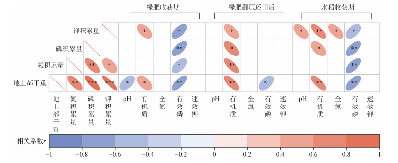 2.3 土壤肥力指标与水稻生物量及养分积累量的关系如图 3所示,水稻植株氮、磷、钾积累量与水稻地上部干重存在显著正相关关系,植株磷、钾积累量与氮积累量间存在显著正相关关系。在绿肥收获期,土壤pH与水稻地上部干重呈显著负相关关系,而土壤有机质含量与水稻地上部钾积累量、地上部干重呈显著正相关关系,土壤有效磷含量与植株养分积累量、干重呈显著负相关关系;在绿肥翻压还田后,土壤有机质含量与植株养分积累量、地上部干重呈显著正相关关系,而土壤有效磷含量与地上部干重呈显著负相关关系;在水稻收获期,土壤有机质含量与植株磷、钾积累量及地上部干重呈显著正相关关系,而土壤有效磷含量与植株养分积累量、地上部干重呈显著负相关关系。