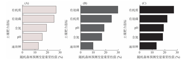 图 4 绿肥收获期(A)、绿肥翻压还田后(B)、水稻收获期(C)土壤肥力指标对水稻地上部干重影响的随机森林分析 Fig. 4 Random forest analysis of impacts of soil fertility indicators on rice dry weight at green manure harvest stage (A), after incorporating stage (B), and rice harvest stage (C) |