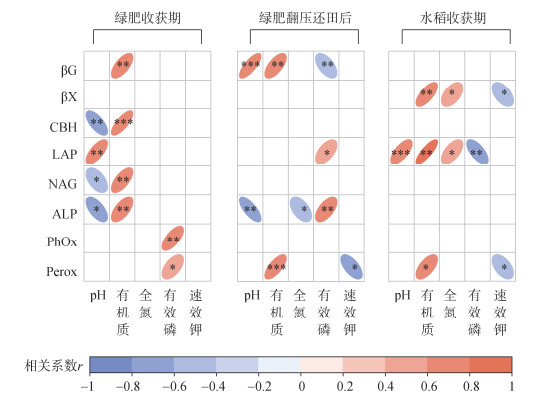 相关性分析结果表明(图 5),βG活性与绿肥收获期及翻压还田后土壤有机质含量呈显著正相关关系,但与翻压还田后土壤有效磷含量呈显著负相关;βX活性与水稻收获期土壤有机质及全氮含量呈显著正相关,与土壤速效钾含量呈显著负相关;CBH活性与绿肥收获期土壤有机质含量呈显著正相关,与土壤pH呈显著负相关;LAP活性与水稻收获期土壤pH、有机质及全氮含量呈显著正相关,与土壤有效磷含量呈显著负相关;NAG活性、ALP活性与绿肥收获期土壤pH呈显著负相关、有机质含量呈显著正相关;ALP活性与绿肥翻压还田后土壤pH及全氮含量呈显著负相关,但与土壤有效磷含量呈显著正相关;PhOx及Perox活性与绿肥收获期土壤有效磷含量呈显著正相关;Perox活性在绿肥翻压还田后、水稻收获期与土壤有机质含量呈显著正相关,与速效钾含量呈显著负相关。
