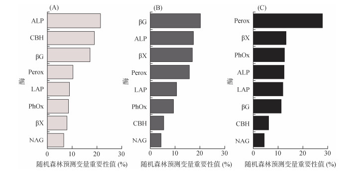 采用随机森林模型分析不同取样时期土壤酶活性对水稻地上部干重的贡献率,结果表明,在各个时期均表现为碳转化酶(CBH、βG、βX、Perox、PhOx)及磷酸酯酶活性对水稻地上部干重的影响最大(图 6)。绿肥收获期,土壤ALP、CBH及βG活性对水稻干重影响的累积贡献率达58%;绿肥翻压还田后,土壤βG、ALP及βX活性对水稻干重影响的累积贡献率达55%;水稻收获期,土壤Perox、βX、PhOx活性对水稻干重影响的累积贡献率达54%。