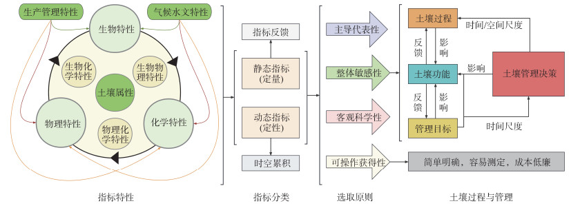 2 耕地土壤健康评价指标 2.1 评价指标的选取原则耕地土壤健康作为一个复杂的功能实体,不能够直接测定[44],而是通过选取土壤理化指标、生产管理指标、环境特征指标和生物指标以及其他指标,来构建评价指标体系,对耕地土壤健康状况进行定性或定量的推测。但是,选择一种或几种与土壤相关的指标来描述复杂的土壤系统是不全面的,需要优选并构建评价指标体系,才能够精确反映耕地土壤的复杂性。国内外学者针对评价指标选取原则进行了较为系统的分析(图 1),包括以下4个原则:①客观科学性。结合研究区实际情况,选取的评价指标要在客观、科学、合理的原则上反映研究区耕地健康现状,各指标之间相对独立又相互关联。②主导代表性。耕地健康取决于影响作物生长的环境因子、农业生产投入和田间管理等生产管理措施。为避免重复,需选择具有代表性的主导因素作为反映耕地功能及其退化威胁影响的评价指标。③可操作获得性。评价指标的选取应简单明确,充分考虑相关指标的易获取性、可利用性,且是可以量化和对比的。④整体敏感性。评价指标应从耕地健康整体角度考虑,所选择的土壤参数必须对耕地健康变化具有敏感性,才能作为耕地健康可持续性发展的有效指标。