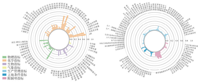 统计结果显示,48篇文献共涉及179个与耕地土壤(包括蔬菜地、园地和植烟地)健康相关的评价指标,包括物理指标17个,化学指标41个,生物指标20个,生产管理指标55个,立地条件指标17个,限制项指标25个和气象指标4个。利用词云图直观体现所有指标类型及参评度(图 2),字体大小代表指标利用率高低。径向条形图展示了7类指标中的具体参数及其使用频率(图 3)。其中,土壤pH、有机质、有效磷、速效钾的使用频率高于60%;土壤全氮、容重使用频率处于40%~60%;使用频率20%~40% 的化学指标有土壤碱解氮、全磷、全钾、电导率、有效锌、有效铁,物理指标有表层/耕层土壤质地、团聚体、含水率,生物指标有土壤呼吸、蚯蚓丰度、微生物生物量碳、微生物生物量氮,土壤重金属有镉、铬、汞、砷、铅;其余指标使用频率均小于20%。