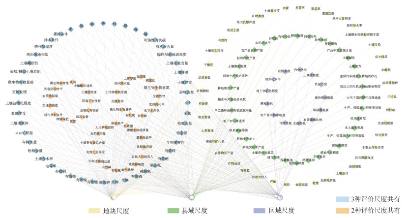 本文中县域尺度的地理范围是以县为基本单位,而区域尺度是包含多个县级行政区或更大面积的地理范围。对不同尺度(包括地块、县域和区域尺度)耕地土壤健康评价指标分析发现,在选择常规指标的基础上,不同尺度分析增选指标也具有明显的差异(图 5)。地块尺度选取指标更多关注的是具体生产管理措施对土壤健康的影响,如种植面积、产量、灌溉次数、农膜残留等较详细的管理指标。在县域尺度上,更多关注水土流失程度、白色污染、农机化水平、城镇影响程度、道路通达度等定性指标和耕地年理论产量、田块平整度、人均耕地等定量指标。在区域尺度上,个性化指标相对较少,选择土壤清洁度、有效灌溉比例、耕地面积、作物结构等指标较多。因为广域空间数据获取困难[19],一定程度上制约了区域尺度的指标选取范围,甚至影响大空间尺度上耕地土壤健康评价研究的发展。本研究同时发现,评价尺度中的县域尺度和评价对象中的耕地,其土壤健康评价指标选取范围均是最宽泛和复杂的。