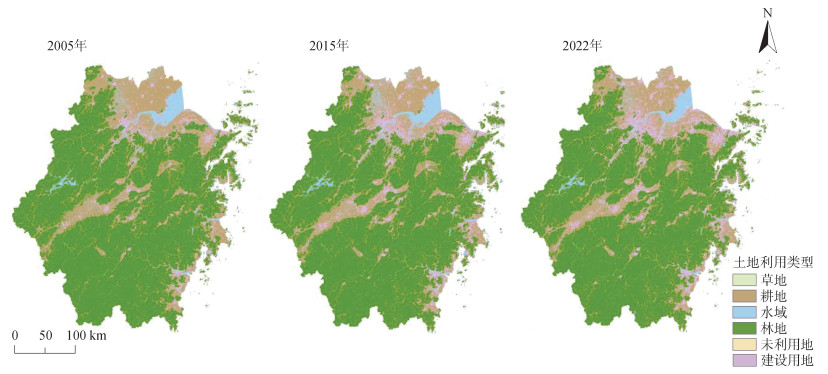 图 1 2005年、2015年及2022年浙江省土地利用分类图 Fig. 1 Land use classification maps of Zhejiang Province in 2005, 2015, and 2022 |