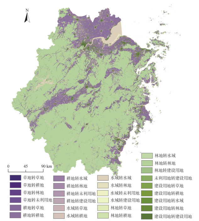 3 结论1) 林地和耕地是浙江省主要的土地利用类型,研究期内浙江省土地利用变化活跃,地类间转换过程丰富,主要表现为建设用地的转入和耕地与林地的转出。