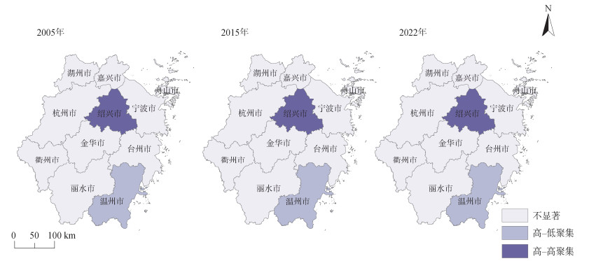 图 4 2005年、2015年、2022年浙江省土地利用净碳排放LISA分布图 Fig. 4 LISA distribution map of net carbon emission from land use in Zhejiang Province in 2005, 2015, and 2022 |