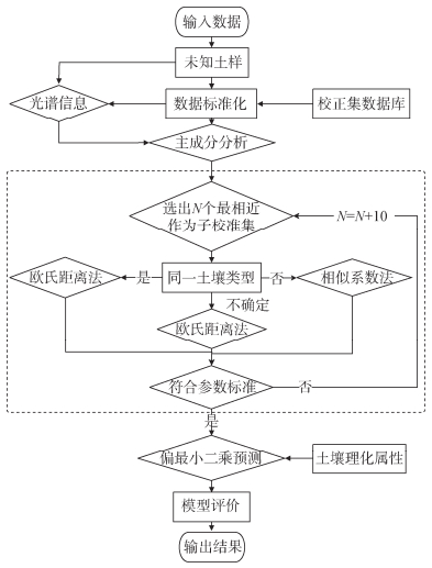 1.3 自适应智能模型算法常见的光谱预测模型算法有偏最小二乘法、人工神经网络法和随机森林法等。自适应模型算法是基于光谱相似性原理和偏最小二乘法结合的模型处理方法,能够有效提高预测精度[12],其思路如图 2所示。首先,建立土壤样本数据库,该数据库包含了土壤样本的理化属性和预处理后的光谱数据。对于新获取的未知样本,从已有的光谱库中通过光谱相似法,检索出一个或多个与待测样本最相似的样本,进行建模集的构建。常用的光谱相似算法主要有欧氏距离法、马氏距离法、系统聚类法、k-均值聚类法、相似系数法和夹角余弦法等。本研究通过欧氏距离法进行光谱相似性选择[9, 13]。