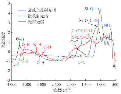 图 3为南京市典型农田土壤的傅里叶变换中红外漫反射光谱、衰减全反射光谱和光声光谱[9]。在400~4 000 cm–1,不同峰位表现出土壤中不同基团的分子振动特征,不同类型的中红外光谱反映的官能团特征又各有特点。中红外衰减全反射光谱显示,水、羧基和羟基中O–H产生的伸缩振动主要在3 560 cm–1处,芳香族中C=C的伸缩振动在1 640 cm–1处,硅酸盐和石英中Si–O的伸缩振动在1 000 cm–1处,NH2的平面外振动在766 cm–1处。中红外漫反射光谱显示,水、羧基和羟基中O–H和N–H的伸缩振动的主要吸收峰在3 560~3 100 cm–1的较宽范围内;脂肪族甲基和亚甲基中C–H的伸缩振动在2 895 cm–1处;而1 660 cm–1处的峰则是酰胺和芳香族中C=C和C=O的伸缩振动。中红外光声光谱显示,3 670 cm–1处的峰为于黏土矿物中O–H的伸缩振动;3 000 cm–1处的微弱峰对应于脂肪族甲基和亚甲基的C–H的伸缩振动;1 954 cm–1处的峰值对应于石英谐波;1 100 cm–1附近的峰对应于硅酸盐中Si–O的伸缩振动以及多糖和核酸中C–O的伸缩振动[14-15]。
