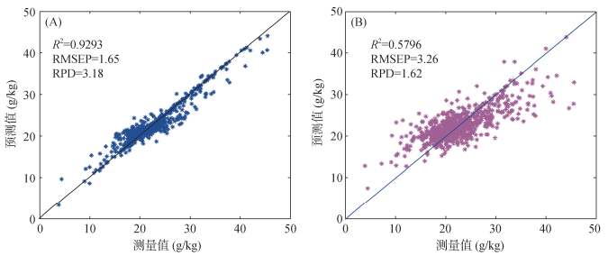 采用南京市土壤中红外衰减全反射光谱数据,通过自适应模型算法,可实现南京市土壤样本中有机质含量的预测(图 5A)。该模型的决定系数(R2)为0.929 3,相对预测偏差(RPD)为3.18。与传统的偏最小二乘模型算法相比(图 5B),其预测均方根误差(RMSEP)由3.26 g/kg下降至1.65 g/kg,自适应模型算法有效地提高了预测精度[17]。