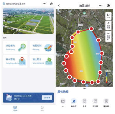 图 7 南京市光谱信息系统小程序主页面(左)和目标田块尺度有机质制图(右) |
