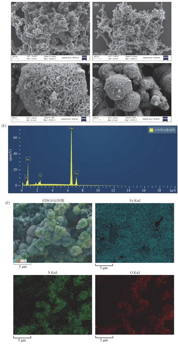 2 结果与讨论 2.1 硫化纳米零价铁的表征扫描电镜(SEM)观察显示,nZVI呈不规则小球形颗粒链状结构(图 1A、1B),这些颗粒表面较为光滑,可能是由于具有磁相互吸引力而团聚在一起。经过硫化改性后,颗粒尺寸变大,表面粗糙(图 1C、1D)。这可能是因为表面生成了絮片状的FeSx层,材料之间的相互吸引力减弱,减少了团聚性,有效地增大了比表面积和反应活性位点。由S-nZVI的EDS元素分析(图 1E)和元素谱图(图 1F)可知,S-nZVI的主要元素为Fe、S、O,且硫化程度较为均匀,说明S元素成功负载到nZVI的表面。